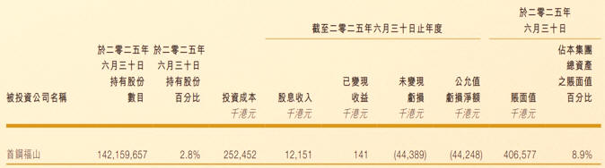 我们于首钢福山之投资于年内录得公允值亏损44,248,000港元,而于二零二五年六月三十日的账面值为406,577,000